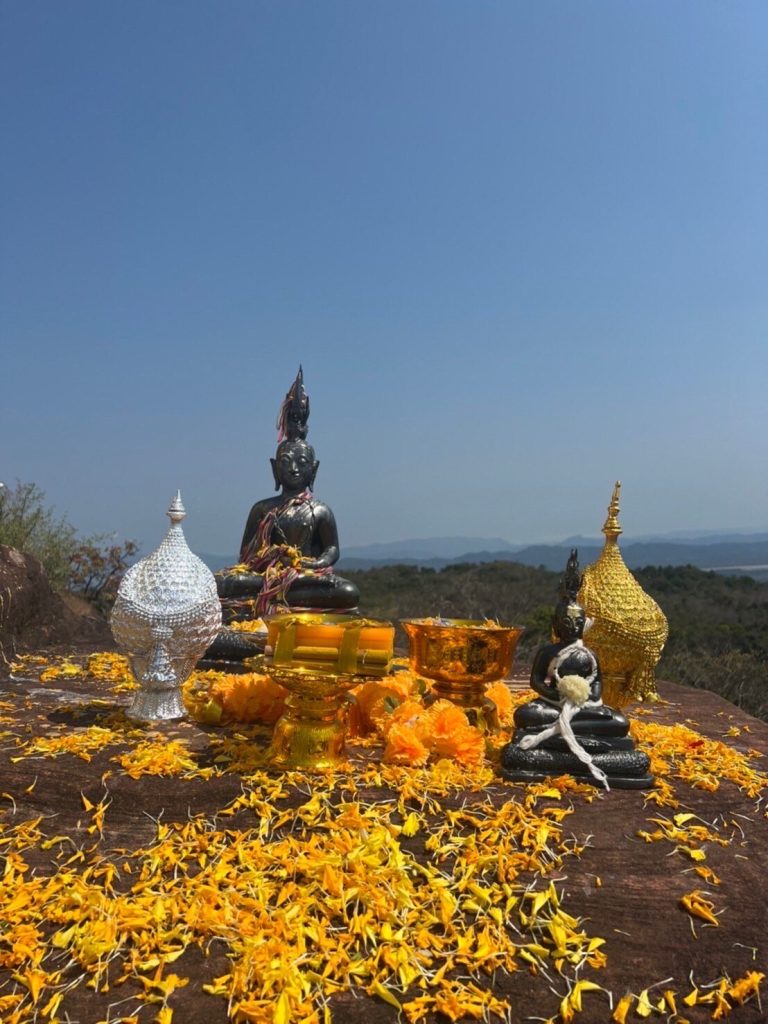 จากนั้นวันที่15กุมภาพันธ์เวลา8.00น. อาจารย์สิบโปและหมอคิวไพ่ สื่อจิต พร้อมด้วยผู้ใหญ่บ้านสำรวย คณะลูกศิษย์ และจิตอาสา ร่วมกันเดินเท้าอัญเชิญพระอุปคุตขึ้นสู่พระธาตุเจดีย์กองข้าวศรีบุญเนาว์ยอดภูลังกา จ.บึงกาฬเป็นระยะทางจากระดับความสูง 563 เมตรจากระดับน้ำทะเลปานกลาง โดยพระธาตุกองข้าวศรีบุญเนาว์เป็นเจดีย์ที่บรรจุพระบรมสารีริกธาตุของพระพุทธเจ้าที่อัญเชิญมาจากประเทศเนปาลเมื่อปีพุทธศักราช 2543 เป็นเจดีย์สีทอง เด่นสง่า อยู่บนยอดภูลังกา