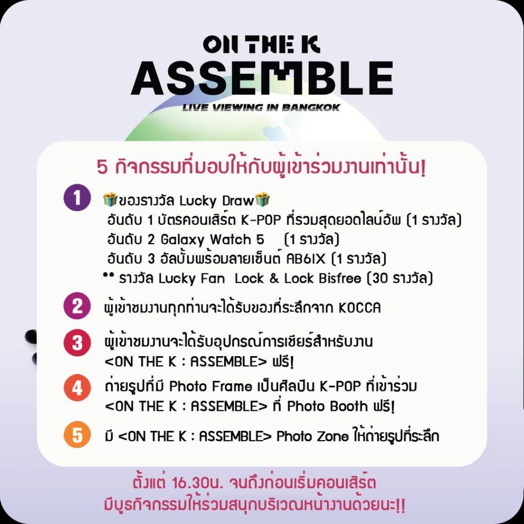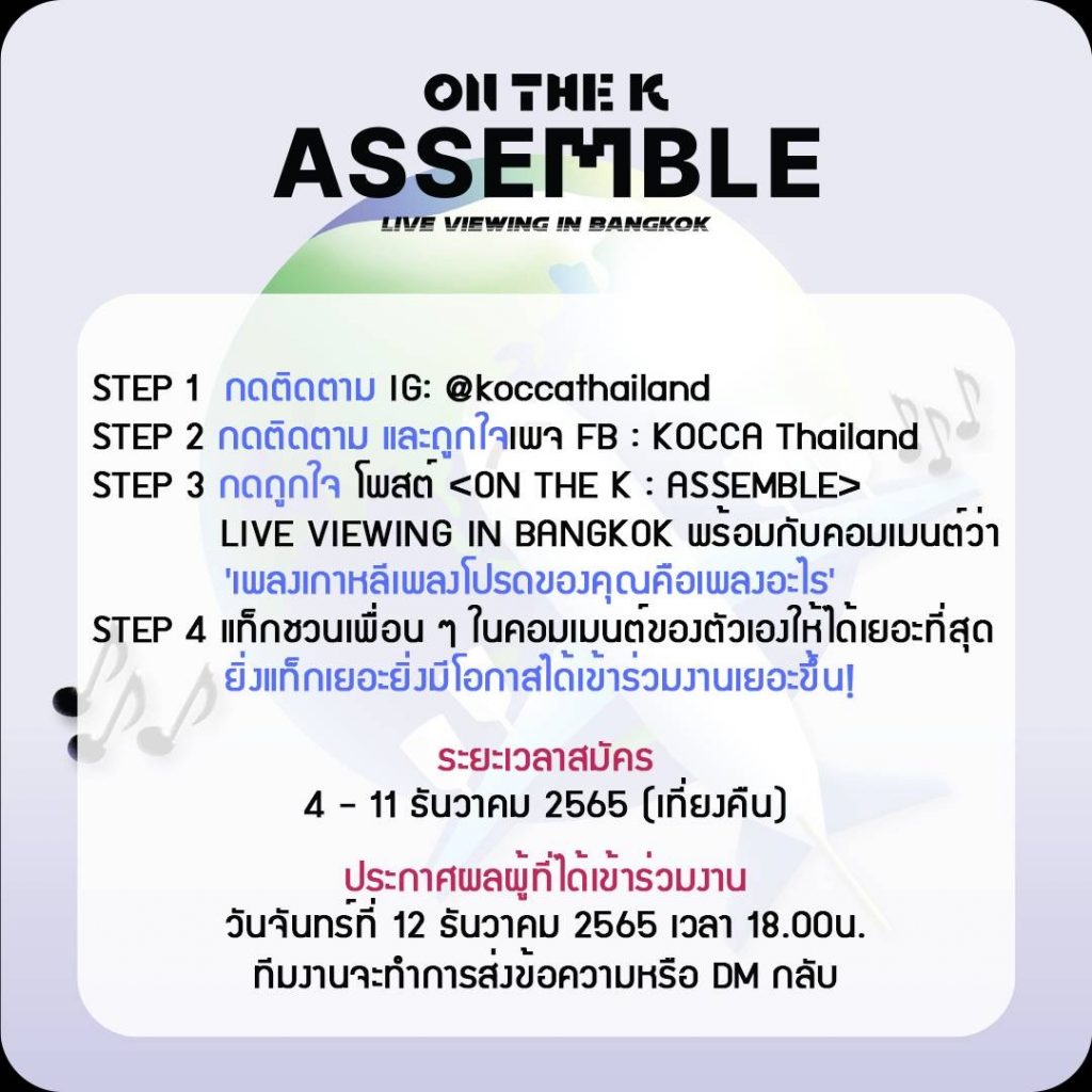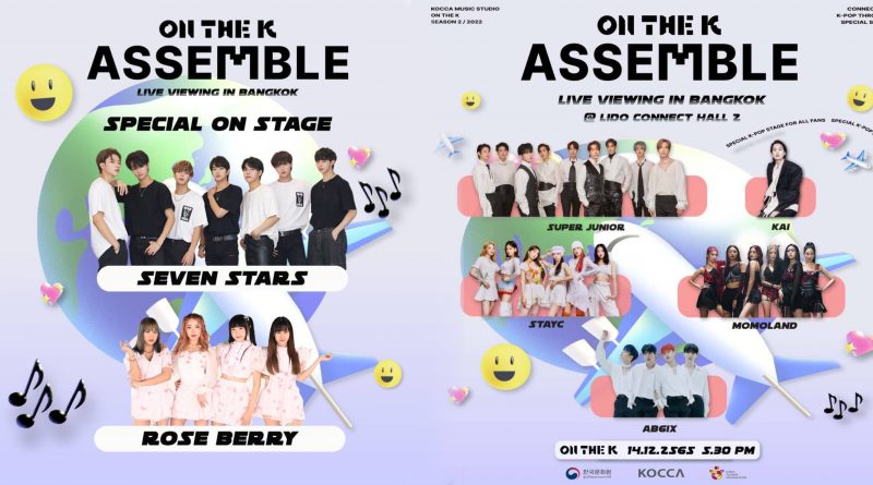 แฟนๆ ที่รัก K-POP และ T-POP ทุกคนอย่าพลาด “ON THE K: Assemble Live Viewing Bangkok” จะจัดขึ้นที่กรุงเทพฯ ประเทศไทยในวันที่ 14 เดือน ธันวาคม พ.ศ. 2565 เวลา 17.30 น. ที่ ลิโด้ คอนเนค ฮอลล์ 2